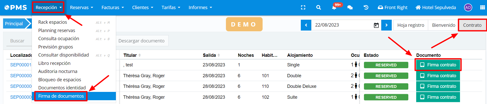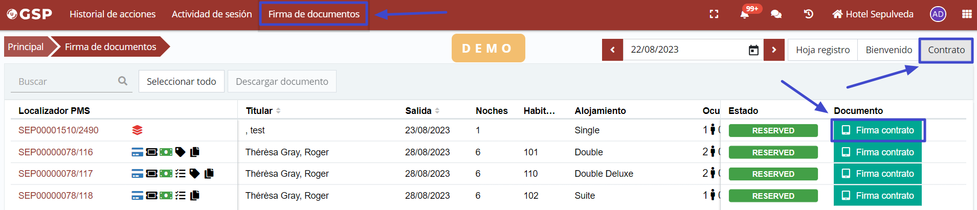In the filter options, select contract, and then select the "Sign contract" field in the reservation where you want to launch the process.