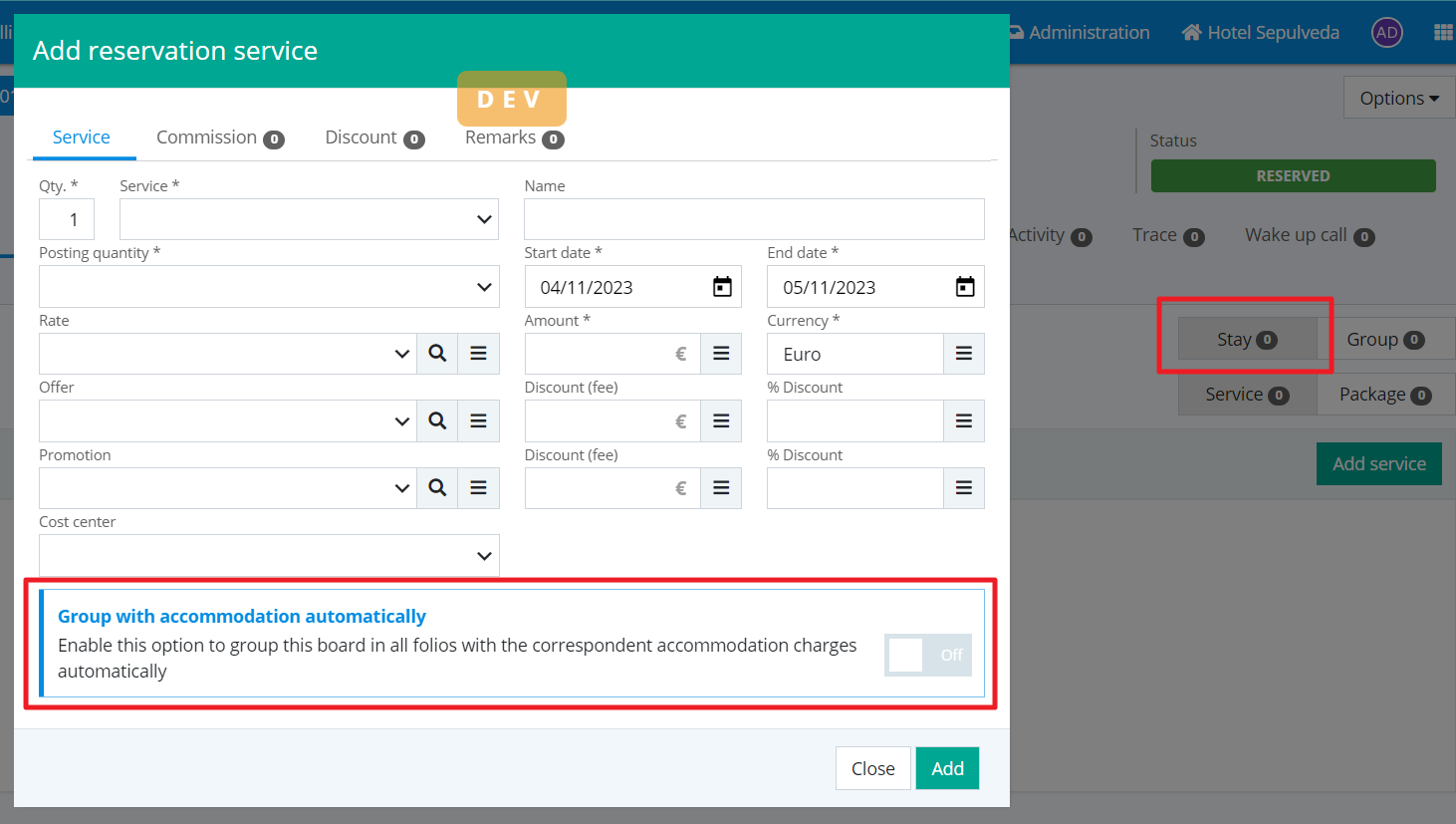 - It is now possible to group group service charges together with the accommodation charge, just like in individual stay reservations. This option has been added in the group services by stay options.