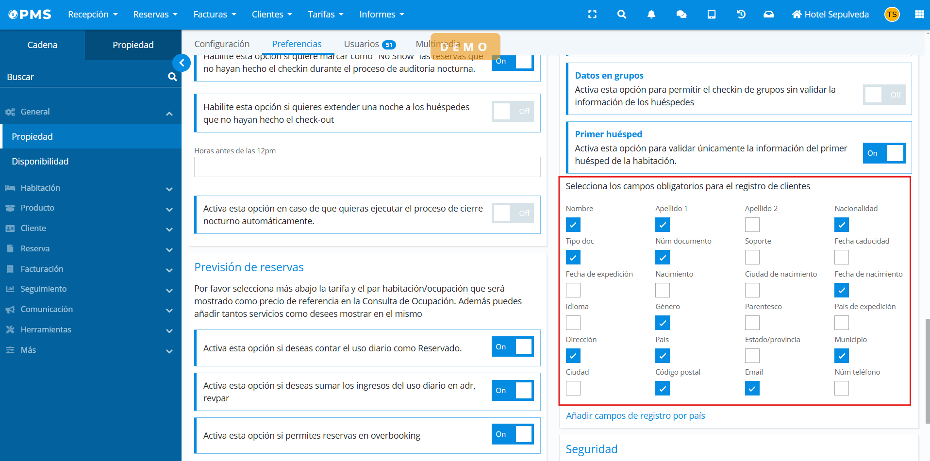 Since it is mandatory to provide new fields when registering your guests, it is recommended to set them as mandatory in the property preferences. The data to be requested varies depending on the guest's nationality, distinguishing between national and foreign clients.