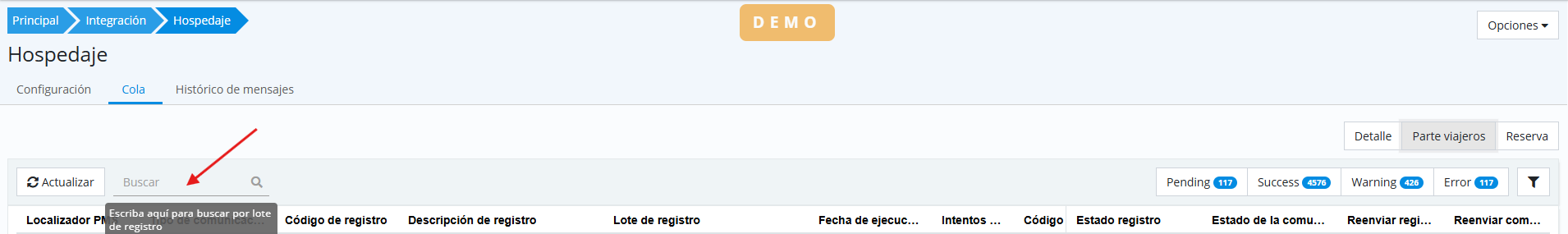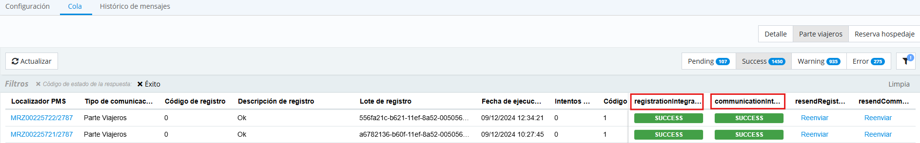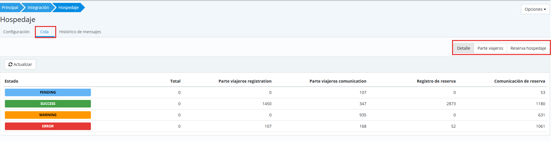 By accessing the Hospedajes integration, you can check the information about submissions in the "queue" tab, divided into a general detail section and by type of submission (Traveler Form or Lodging Reservation):