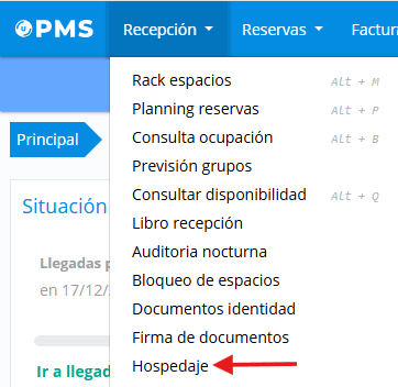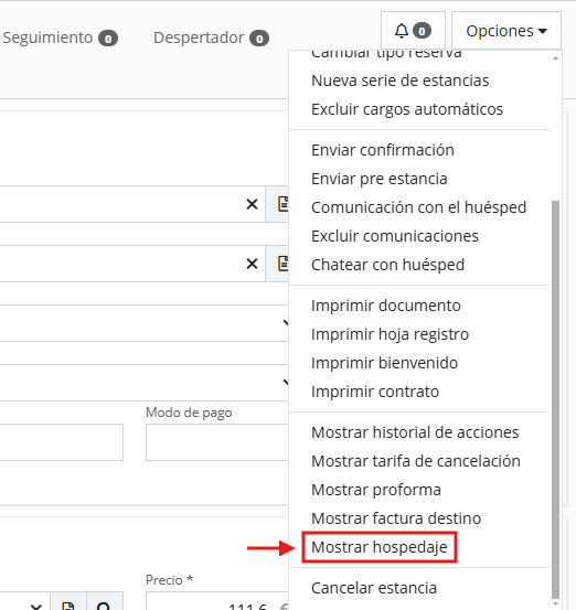 It is also possible to view the submission status to hospedajes from the reservations themselves, using the "Show hospedaje" option available in the stay options menu.