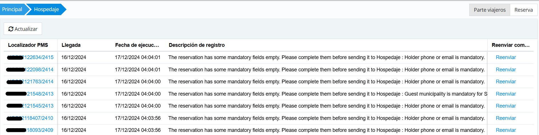 A new screen has been enabled, accessible from the reception menu (after activating the corresponding user role permission), to view, correct, and send all records that have not been sent to hospedajes because the data is invalid: