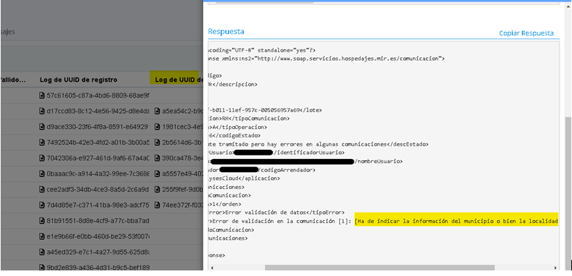 Two "status" columns can be viewed. The first, "registrationIntegrationHospedajeRequestStatusType" corresponds to the submission sent from Ulyses Cloud to the Hospedajes platform. The second column "communicationIntegrationHospedajeRequestStatusType", refers to the response from hospedajes after processing the sent information: