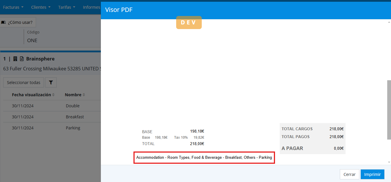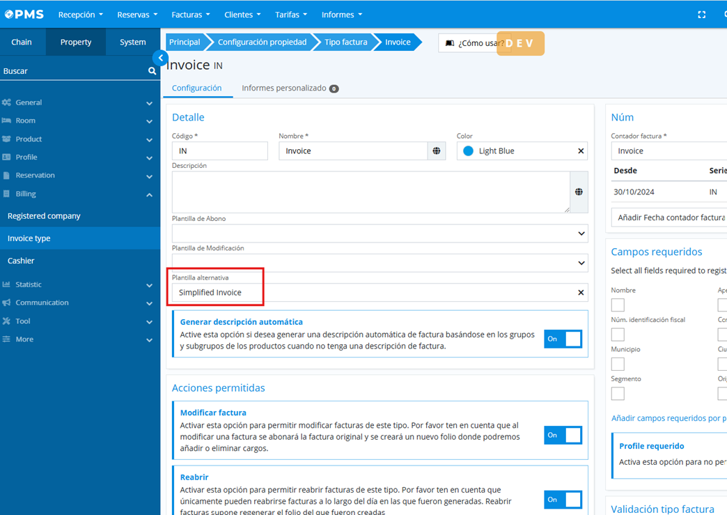 The possibility has been added so that when closing a folio, if the invoice type does not meet validations, an alternative invoice type is generated. For example, if a regular invoice is for an amount less than €400, a simplified invoice is generated.