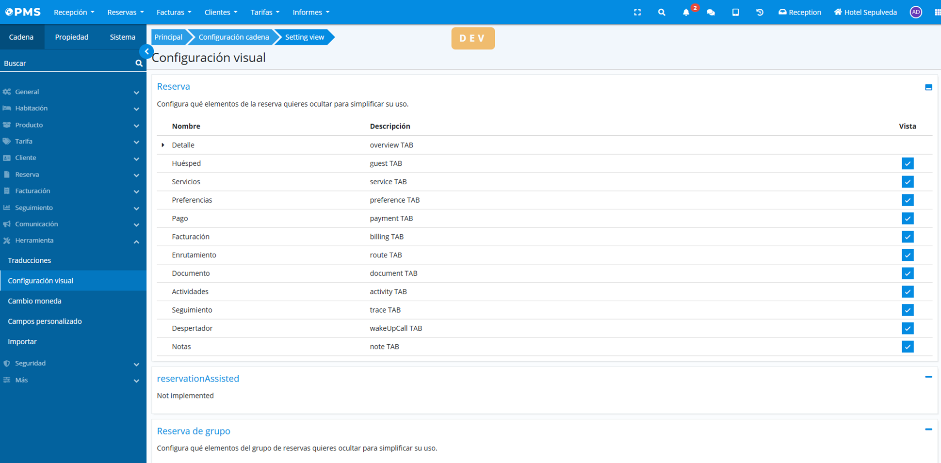 Chain-level configuration of visible sections in reservation, group reservation, and event screens