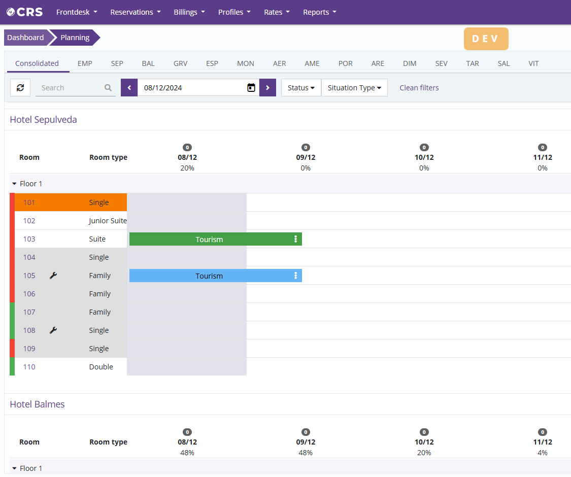 CRS Ulyses CloudMulti-hotel rack and planning view from CRSFrom the CRS module, you will be able to view both the rack and the planning of all your properties without needing to filter or change tabs: