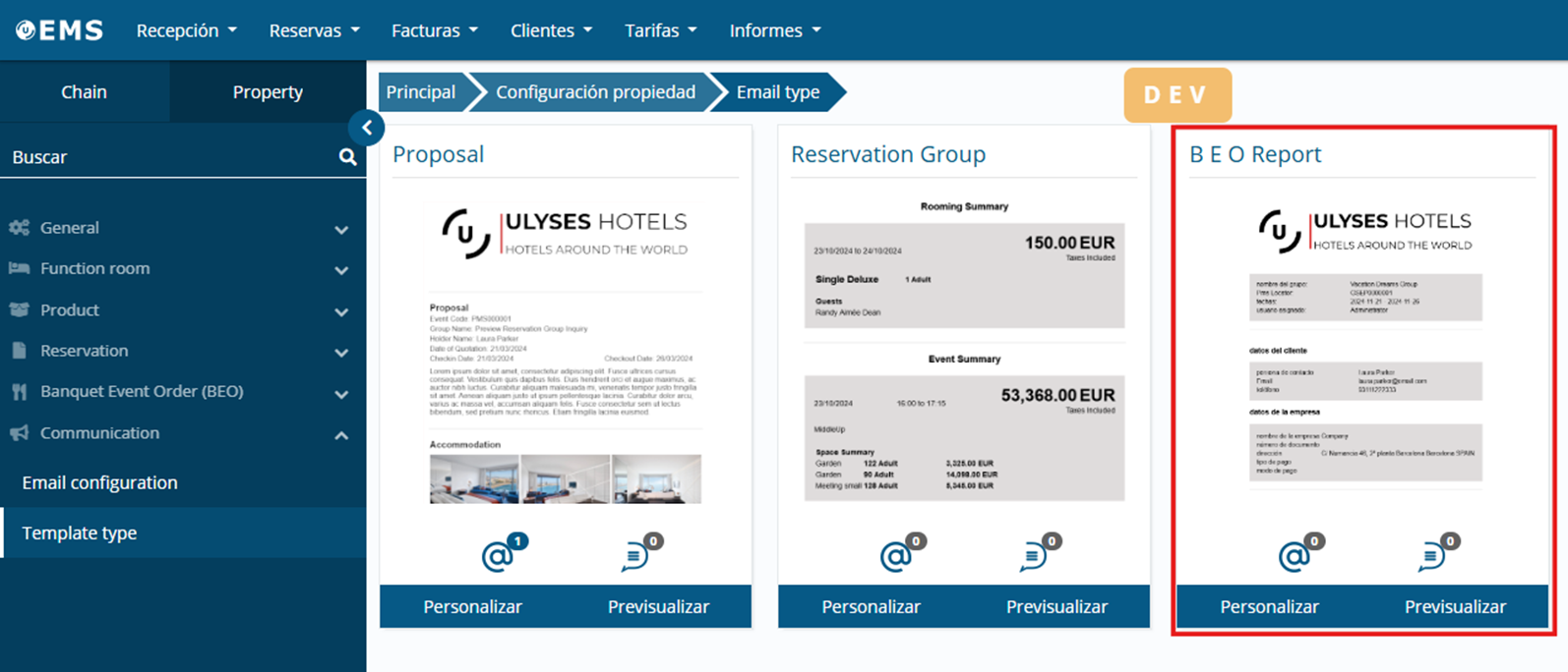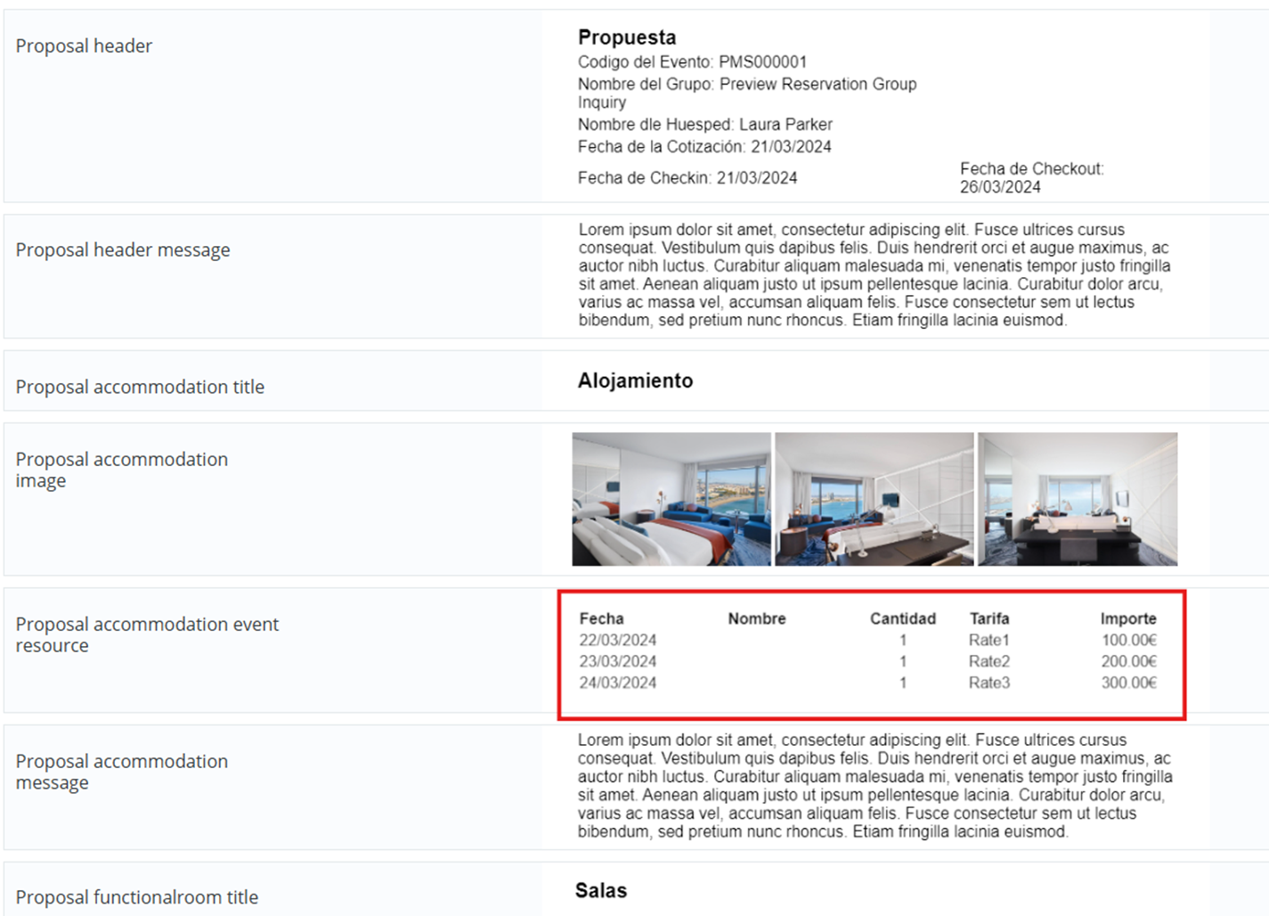 It is now possible to configure the BEO template with sections, in the same way as the proposal and group reservation confirmation templates: