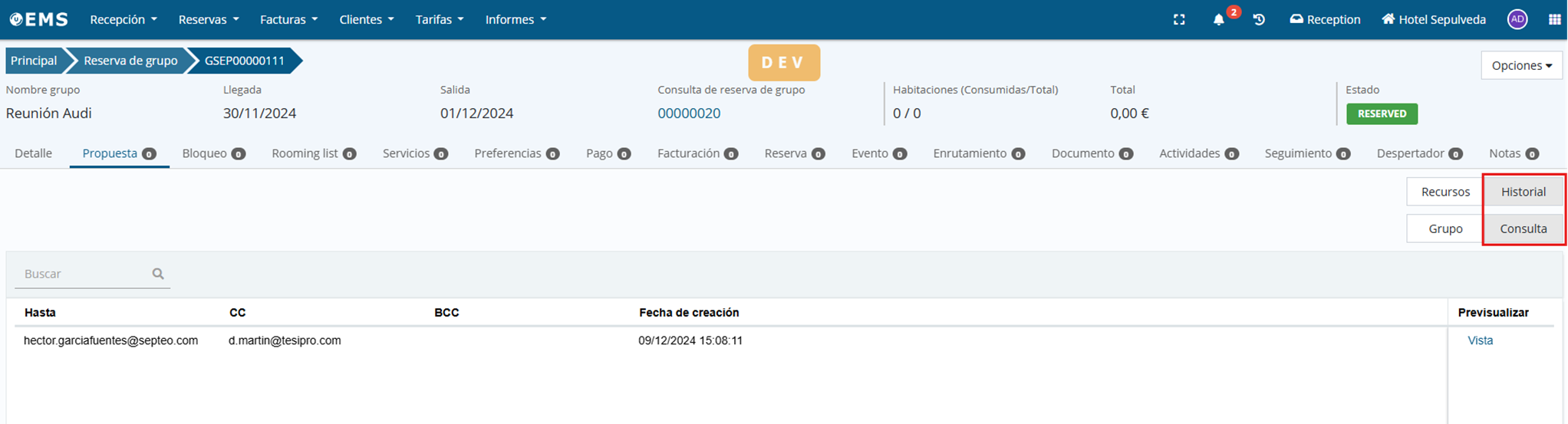 View history of “proposal” sent in group query when confirming groupIt is now possible to view from the proposal section of an already confirmed group (that comes from a group reservation query) the history of proposals that were sent from the group reservation query itself.