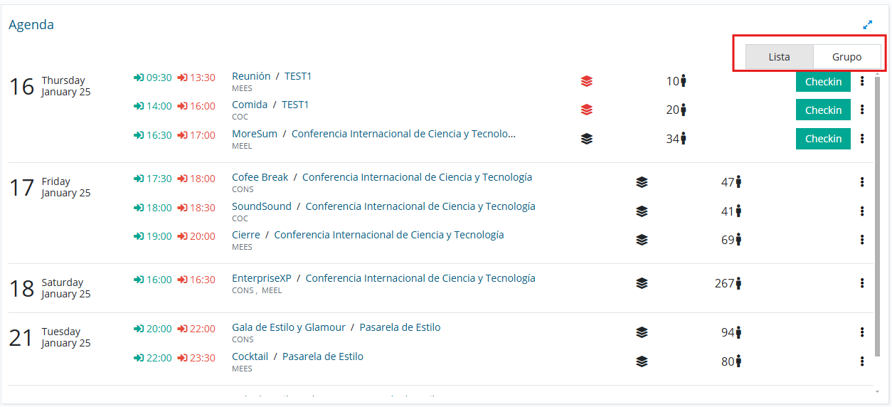 The agenda widget display on the main dashboard has been improved, allowing you to select the event list display option by day or sorted by group: