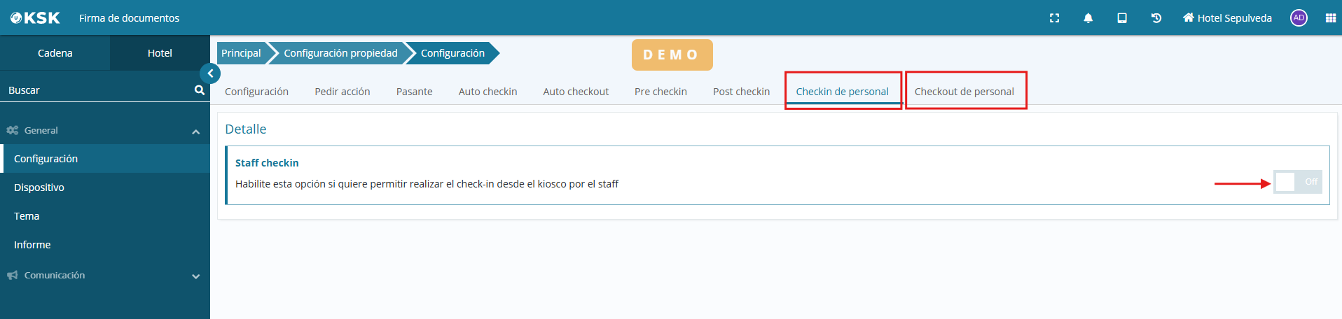 To do so, in the KSK configuration, the "Staff check in" and/or "Staff check out" settings must be enabled: