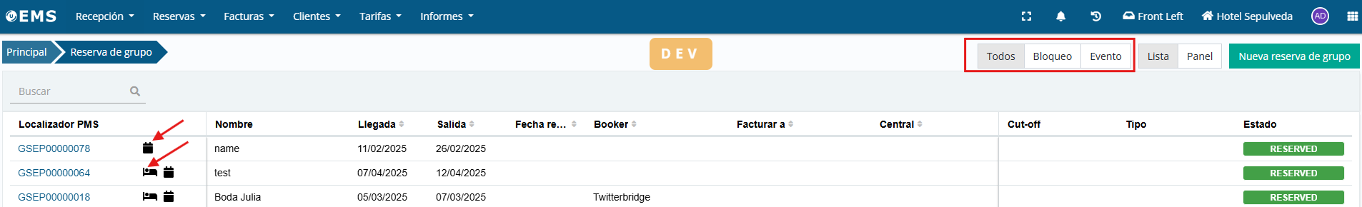 On the group reservation screen, it is now possible to filter the displayed groups based on whether they have room and/or event blocks.