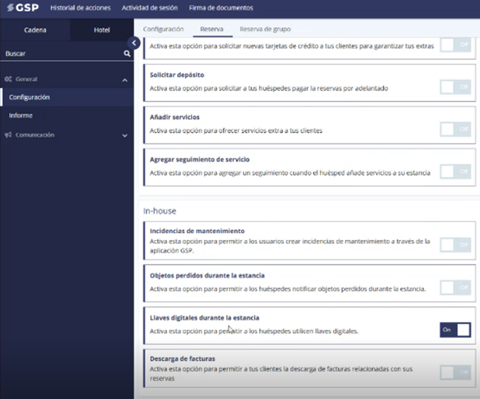 In GSP. Hotel Configuration. Reservation tab. In the In-house section, activate digital keys during the stay.