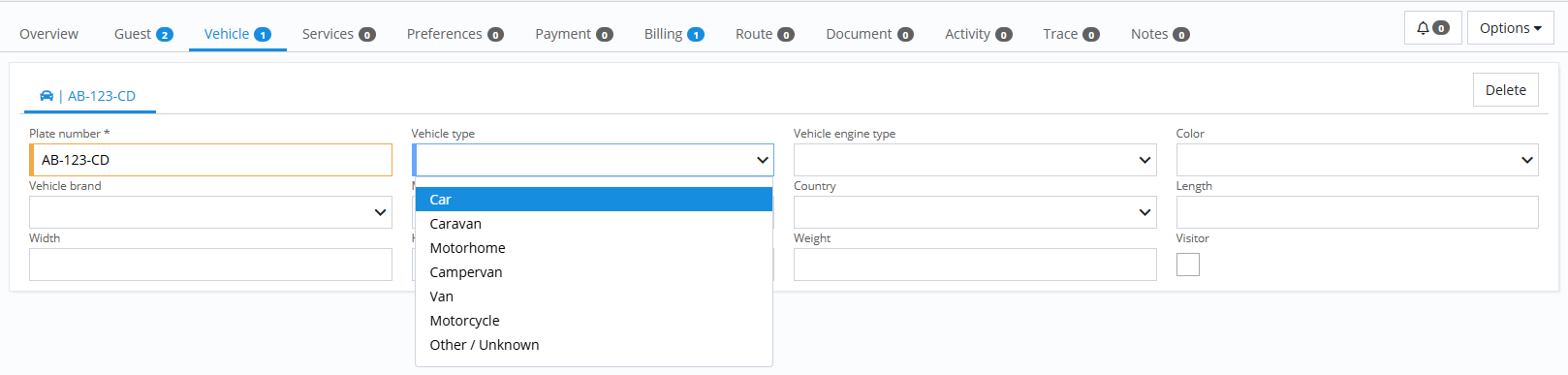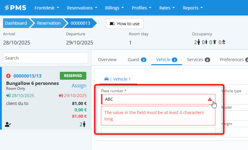 It will then be mandatory to complete at least the license plate of the vehicle in this tab in order to save the stay.
