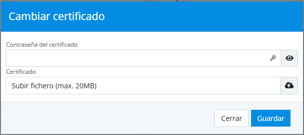 By clicking on the "Change certificate" option, a new window will open where you must upload the digital certificate and enter its password: