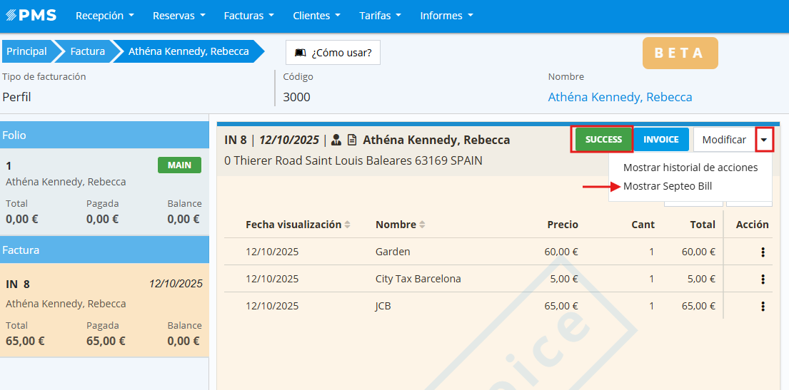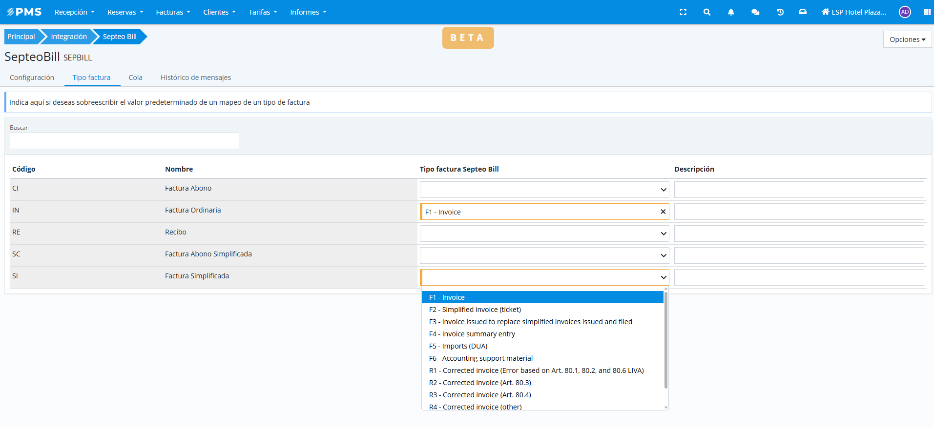 It is very important to correctly map invoice types to avoid errors when sending invoices to the AEAT. In the "Invoice type" tab of the integration, the invoice types created in the property can be mapped against the valid invoice types for the Spanish Tax Agency.