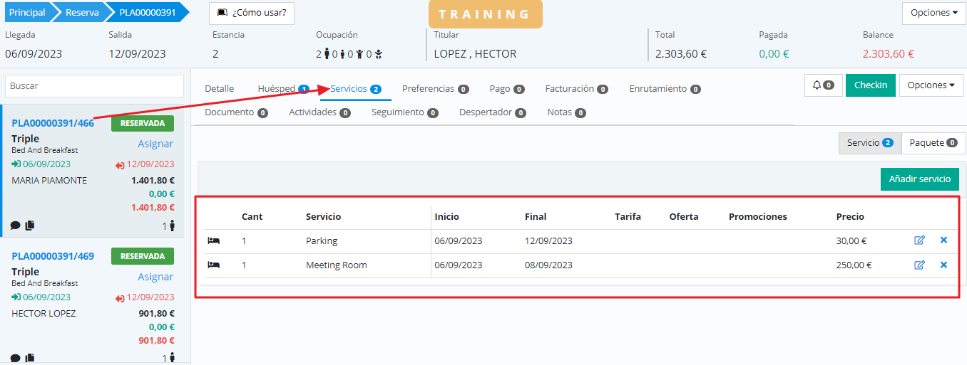 Additional booking services are, as the name suggests, extra services that properties offer to their clients and that can be contracted either online or in person. In a multi-stay booking, the Services tab shows the additional services contracted for the selected stay: