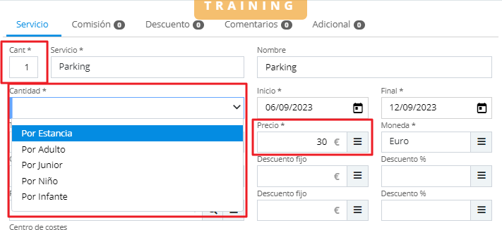 - Price: This is the price that will be charged per night for that service. At this point, it is very important to consider the relationship between the quantity, the amount, and which variable it is applied to. For example, when charging for extra breakfast, it is usually charged per occupant. On the other hand, for services like Parking, it is charged per stay, as in the example below: