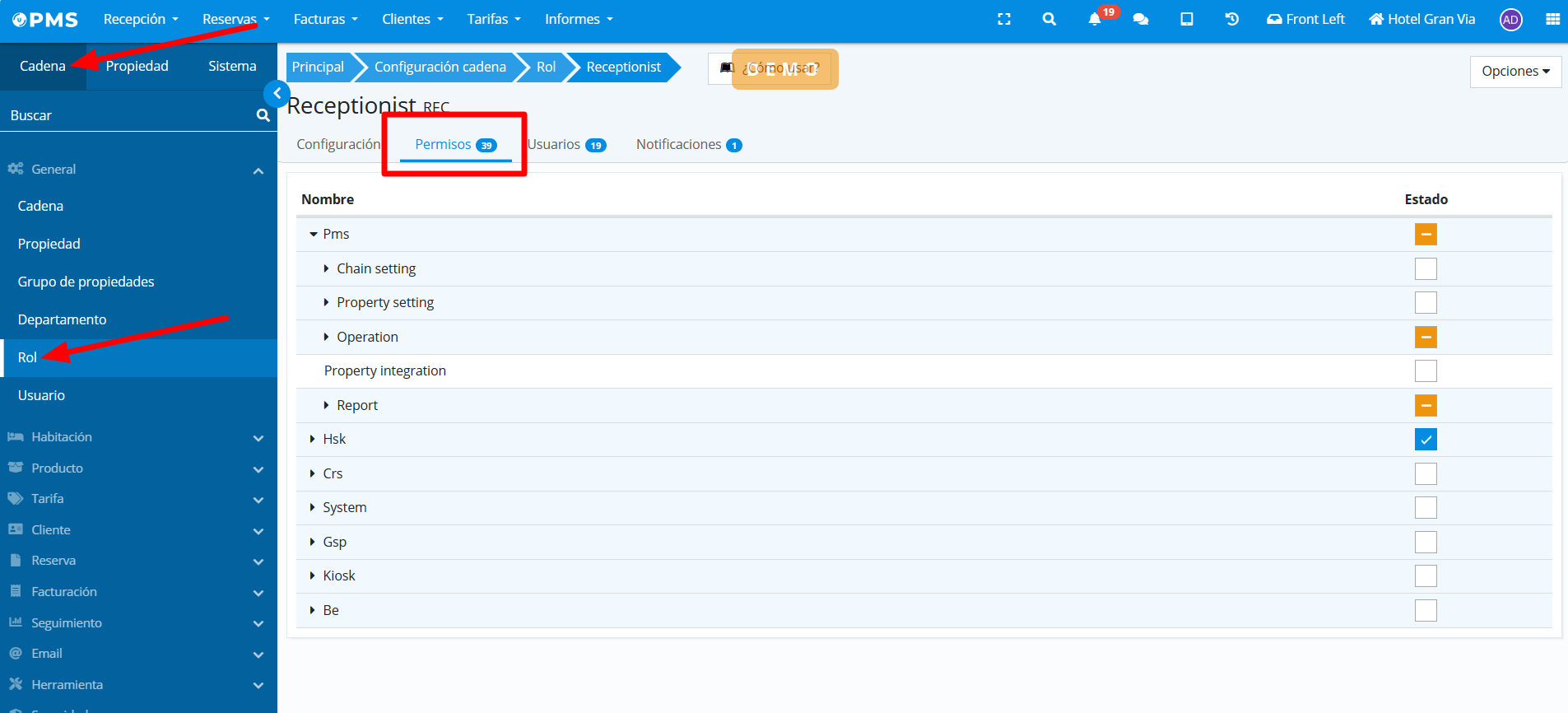 - Chain settings gives access precisely to the management of elements in the chain. If we select all the children, the overall result of Chain Settings (the parent) will mean that this role will have access to all chain options and will be symbolized as "Check". If we do not select any, we will not have access to any of the options. If, on the other hand, there are selected and unselected options, the "-" symbol will be shown as status.