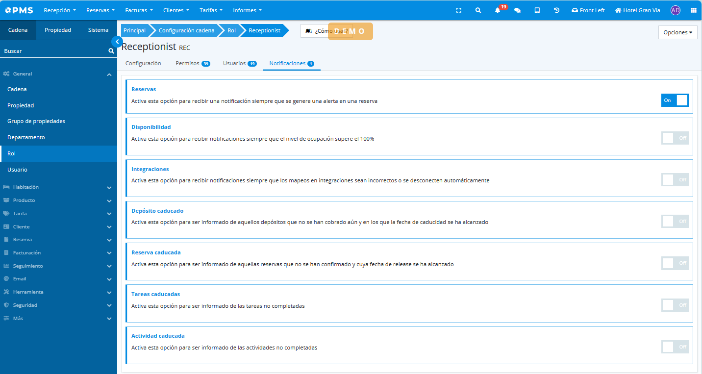 - Property settings allows access to the configuration menu of each hotel in our chain. The functionality is identical to the previous one.