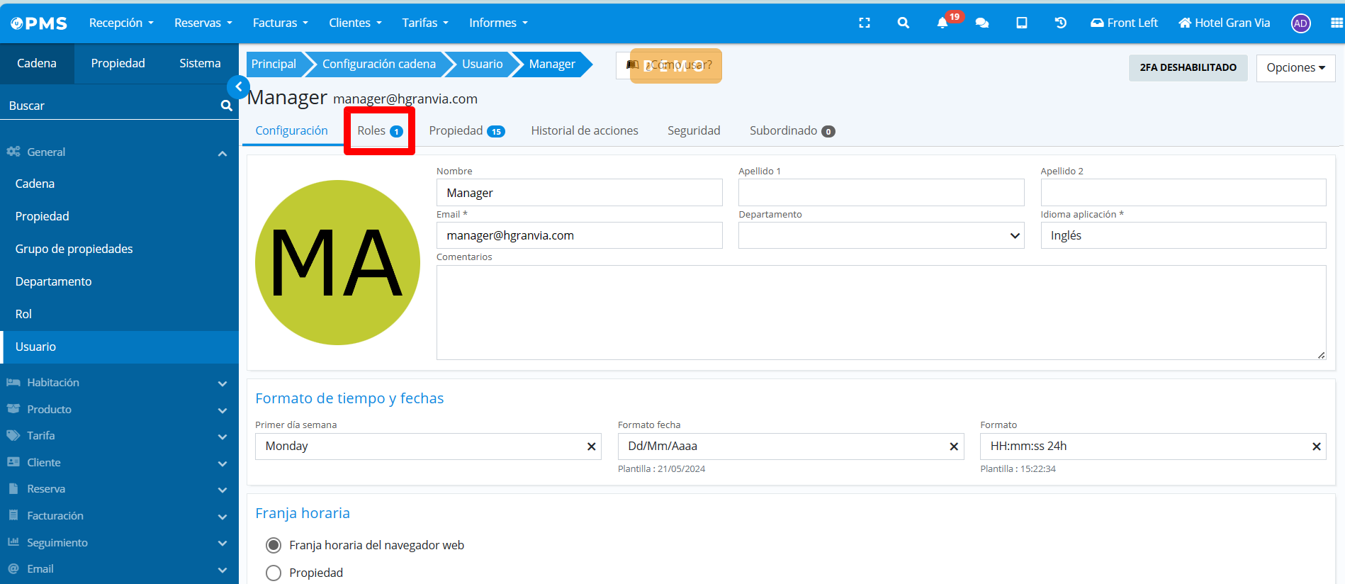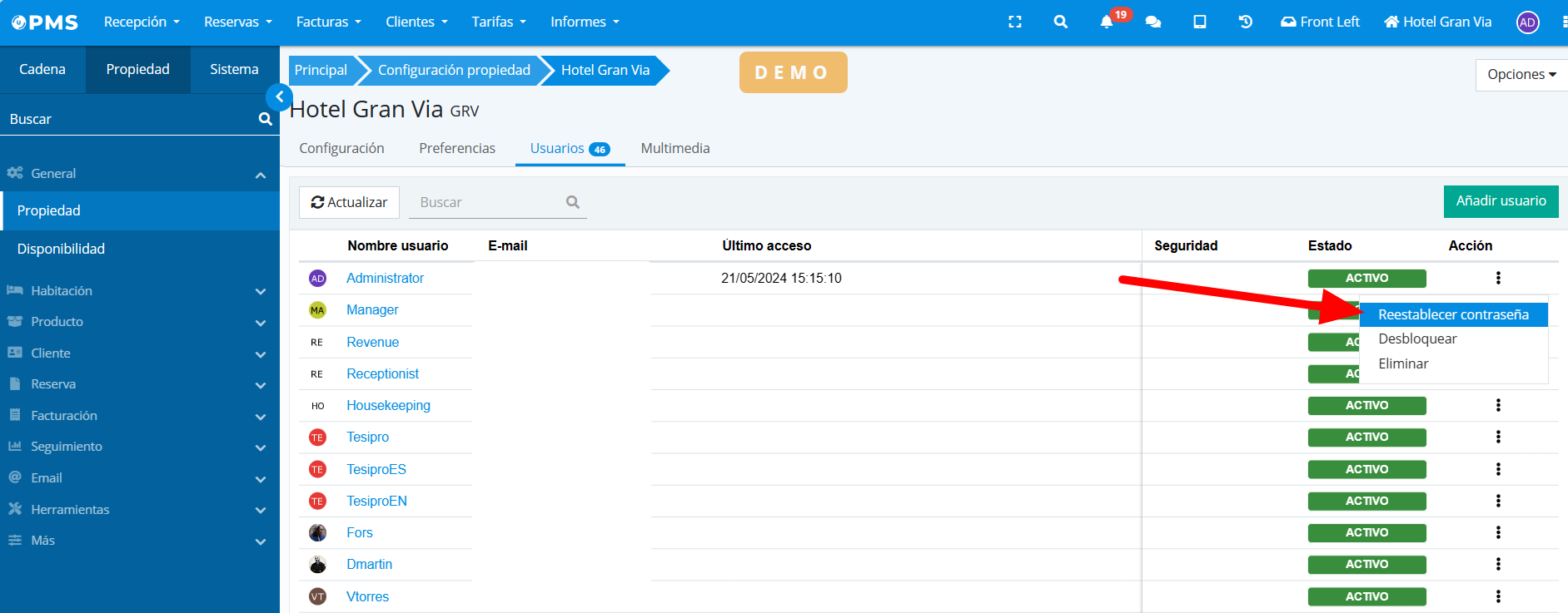 - Property settings > Property > Users tab