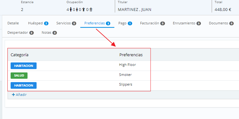 'Preferences' are requests and/or priorities that clients inform us about and that can help us improve their stay. These preferences can be linked to the client's profile or to a specific reservation. The sum of these preferences can be found and managed in the reservation detail > Preferences section.