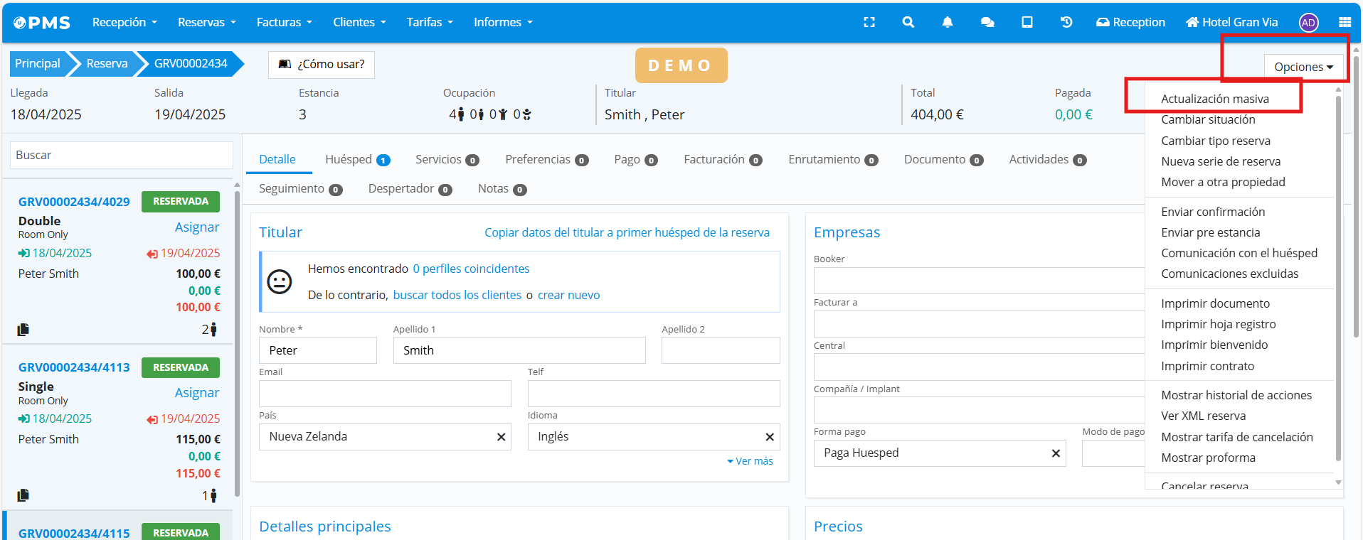The bulk update of reservations allows you to make changes to all stays in a reservation. To do this, select the information you want to modify in