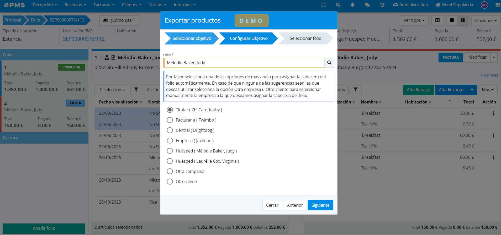 - This option is useful if we want to transfer the charges to a PM folio, requesting the necessary information to create a new folio in a different account.