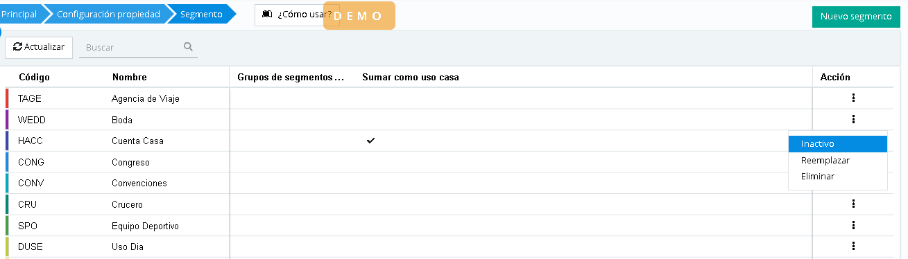 Let's imagine we want to delete a segment, and it turns out that this segment is not assigned to any rate, offer, promo, or reservation. Well, if that were the case, after selecting Delete from actions, a message will appear inviting us to confirm or not the deletion action.