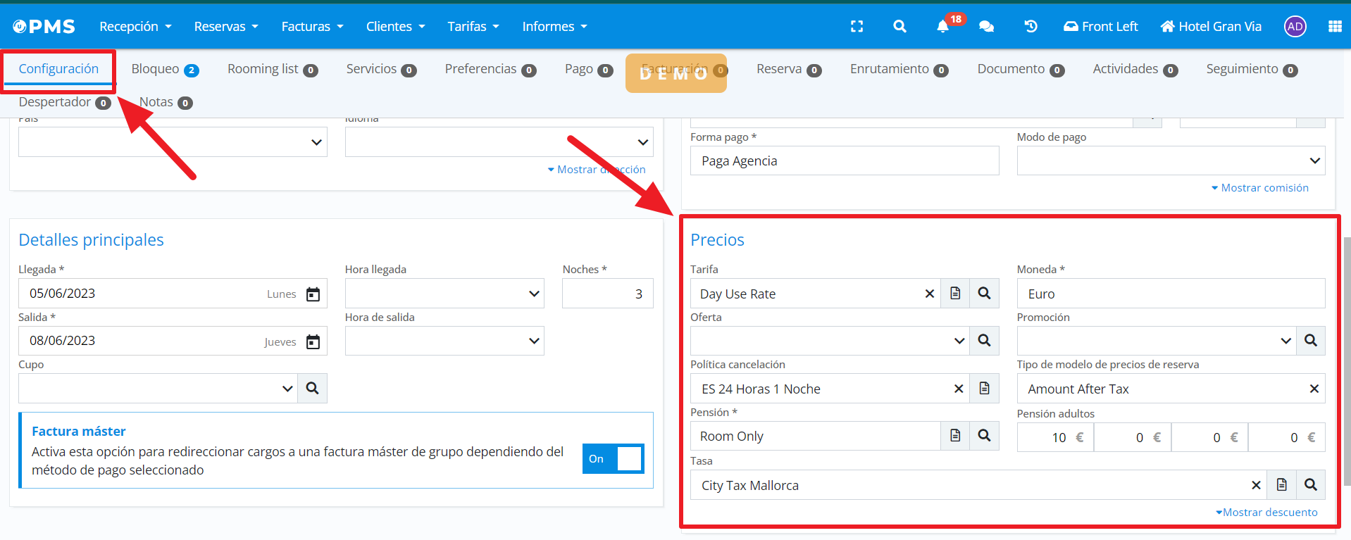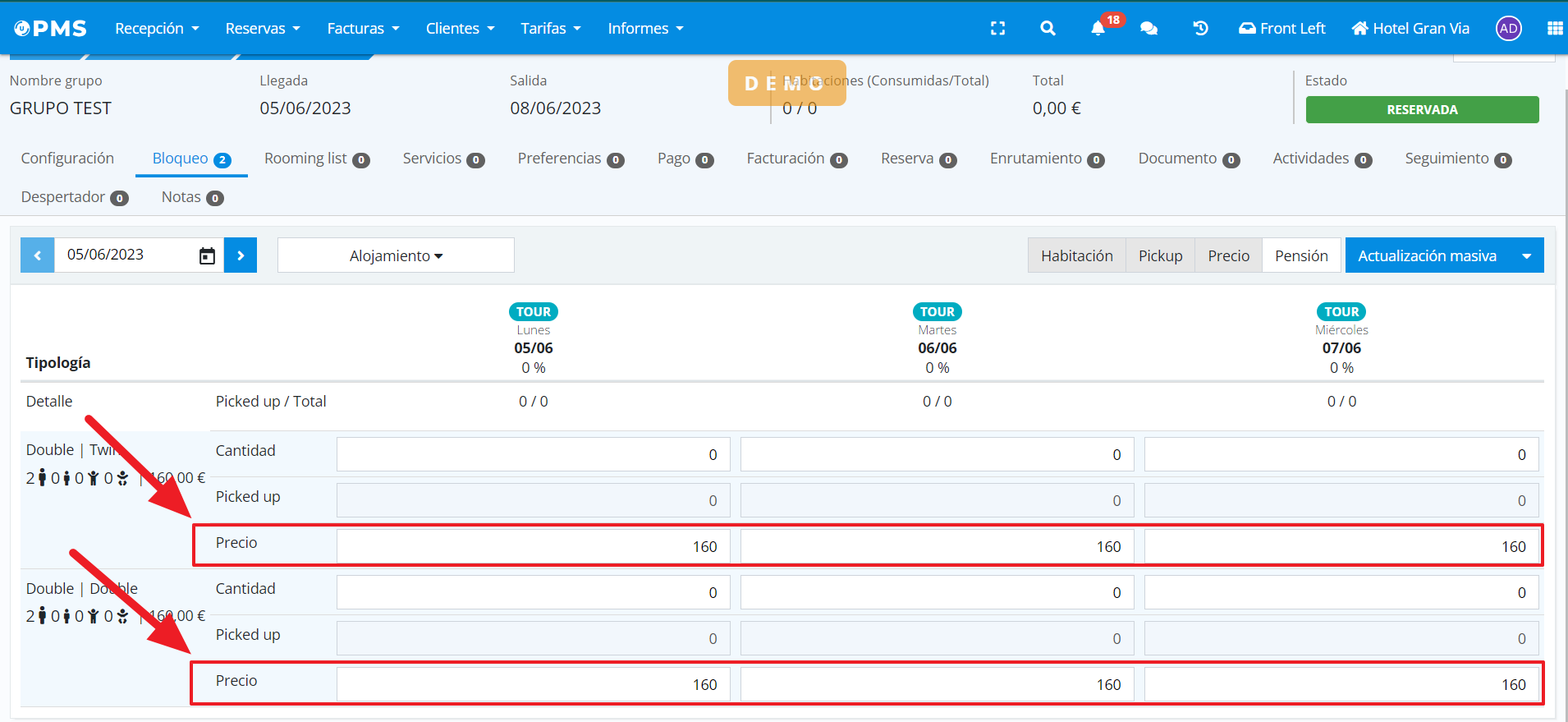 If we do not provide a price in these sections, the price already set in the rate, offer, or promotion configured for the group in the group configuration and registered in the PMS will be used.
