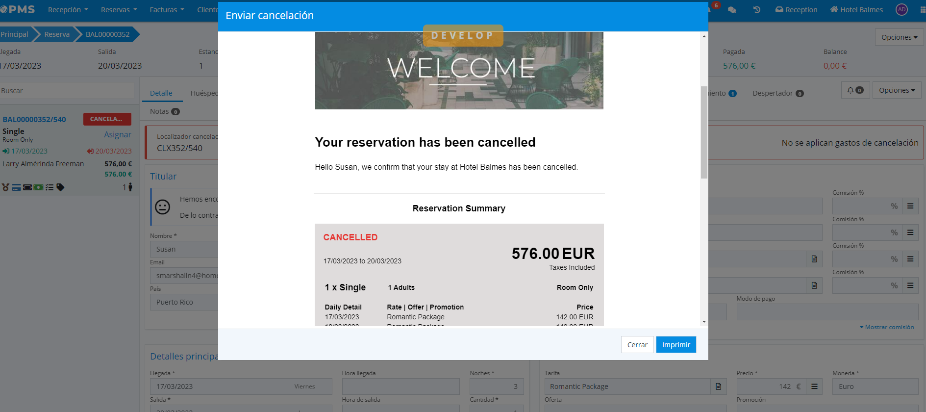 2. Cancel reservation, with the option to send it by email
