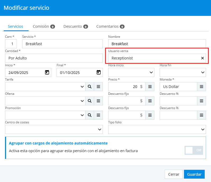 *En el caso de informarse el usuario de venta al añadir un servicio a una reserva, no podrá ser modificado cuando se genera el cargo en el folio. Sin embargo, si el usuario de venta se indica al añadir un cargo de forma manual en un folio, sí que se permite su posterior modificación, quedando siempre registrada en el historial de acciones.