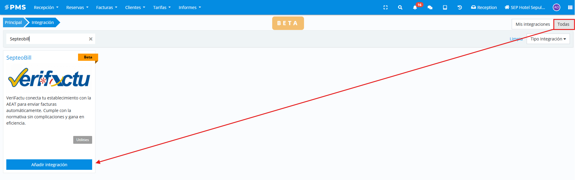 El primer paso es añadir la integración de "SepteoBill" disponible en el marketplace de Ulyses Suite.