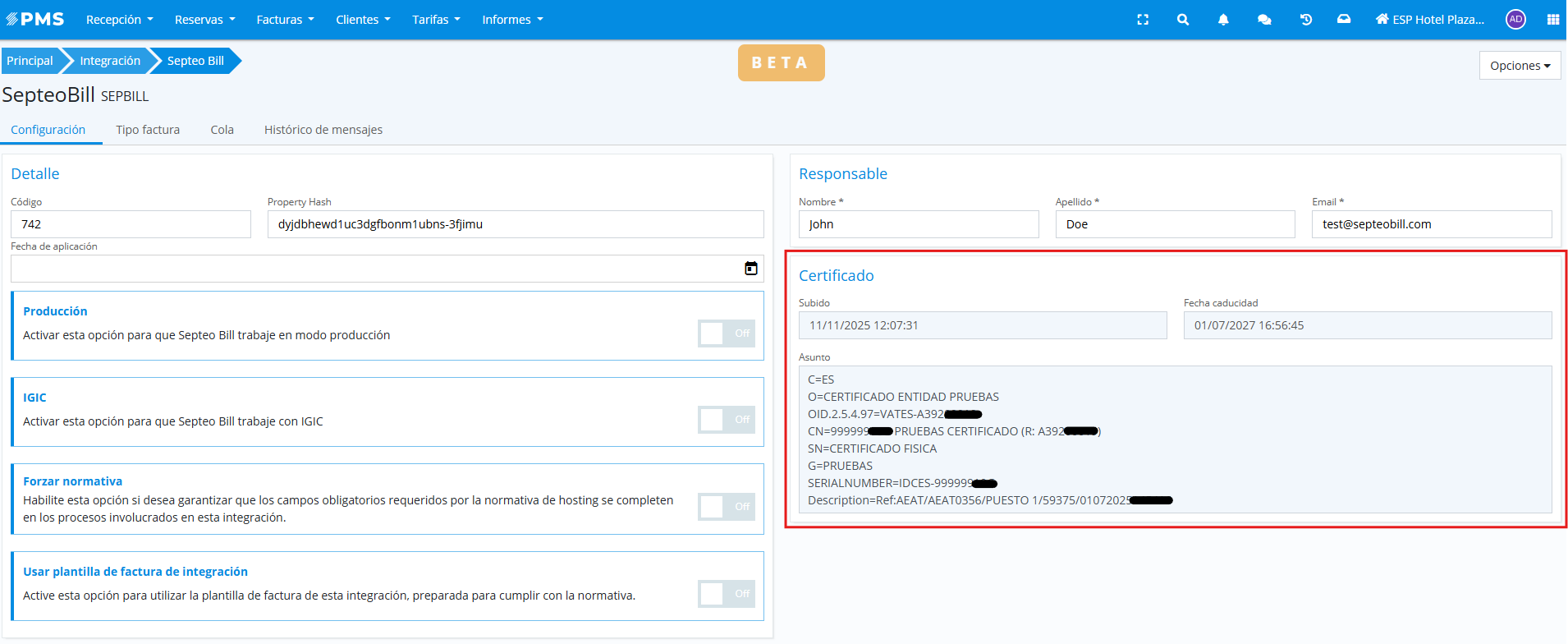 Tras informar esos campos, clicar sobre "guardar cambios" y automáticamente se creará el perfil en SepteoBill y se asignará y cumplimentarán los campos de "código" y "property hash" de la sección Detalle también de forma automática.Cargar el certificado digital