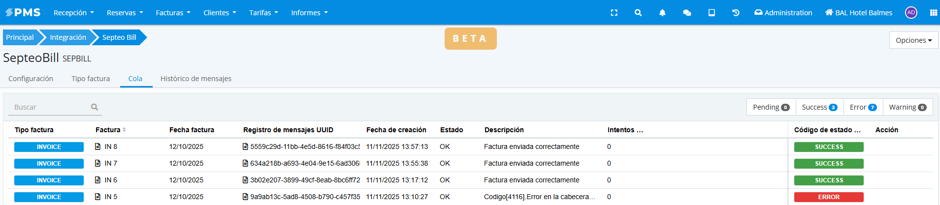 En la pestaña de cola de la integración se listarán todos los envíos realizados a Verifactu y el estado de los mismos:
