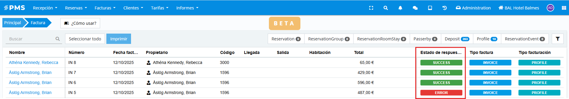 Es muy importante realizar un correcto mapeo de tipos de factura para no incurrir a errores en el envío de facturas a la AEAT. En la pestaña "Tipo factura" de la integración, se podrán mapear los tipos de factura creados en la propiedad contra los tipos de factura válidos para la Agencia Tributaria española.