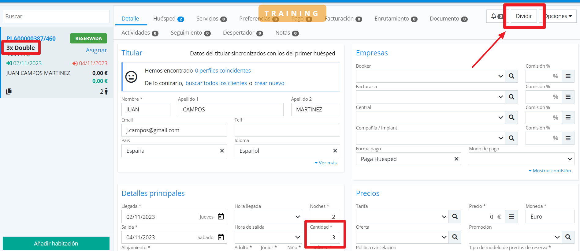 Tras Dividir la reserva Ulyses Cloud generará 3 estancias idénticas a la original con cantidad unitaria.