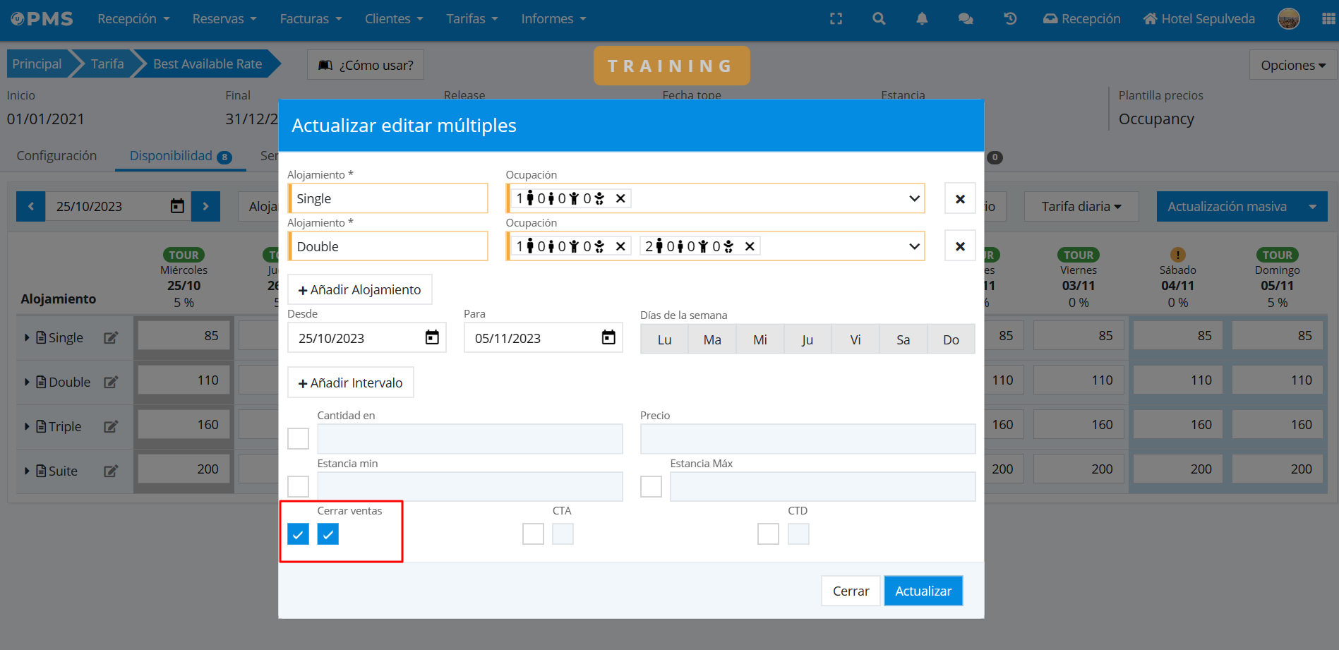 - Seleccionar estancias mínimas y/o máximas e indicar su valor correspondiente, y seleccionar si deseamos cerrar a la llegada (CTA) o a la salida (CTD)