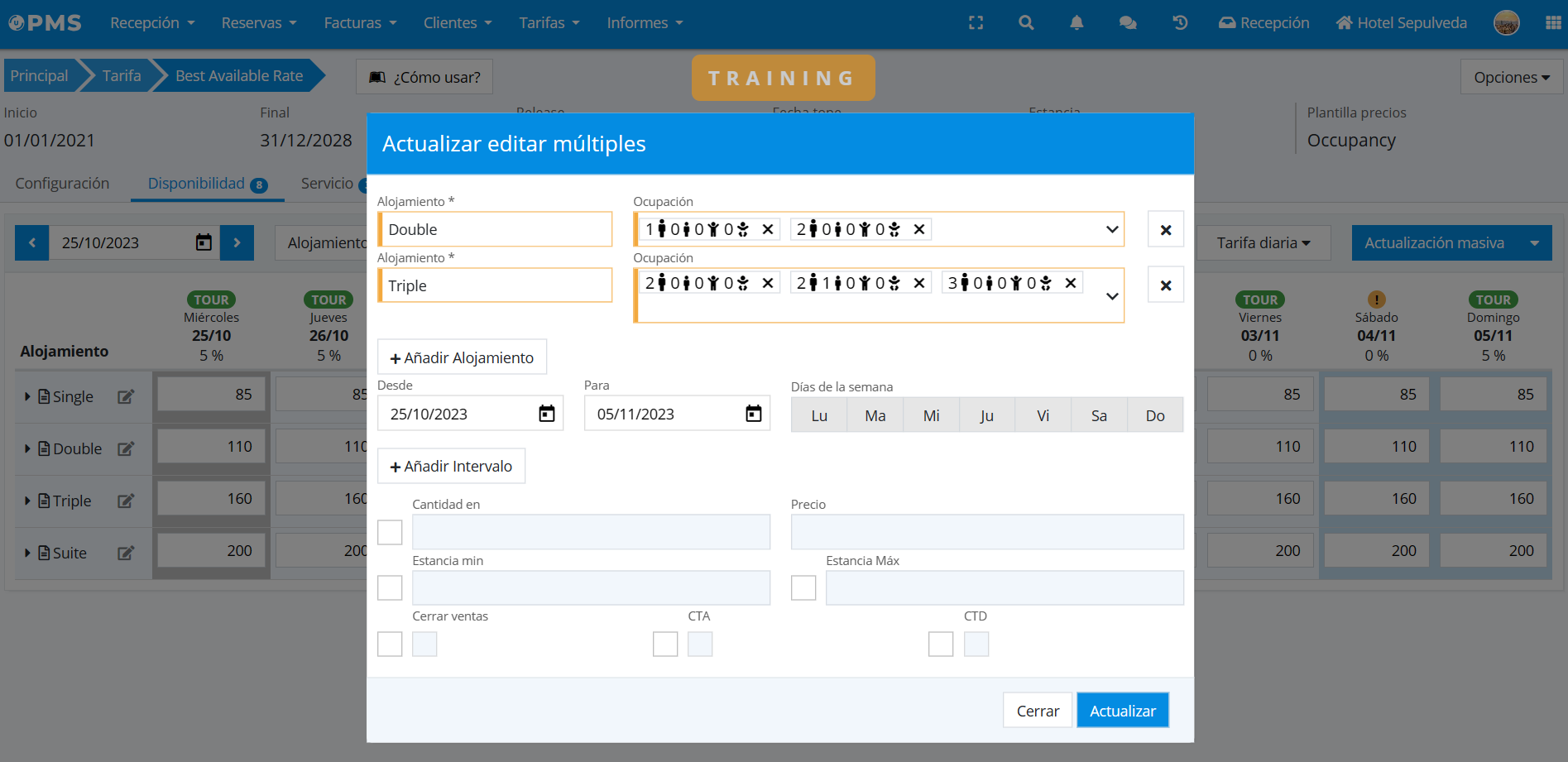 - Entrar en el detalle de una tarifa > pestaña Disponibilidad