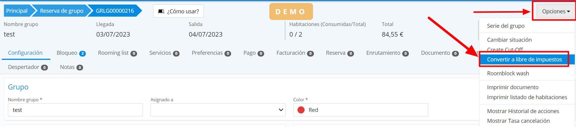 Cela préparera les folios de ces réservations pour travailler exonérés de taxes ou avec les taxes IGIC. L’étiquette suivante apparaîtra pour informer l’utilisateur du mode de facturation :