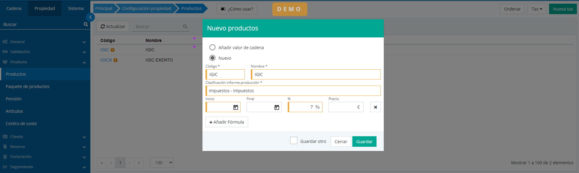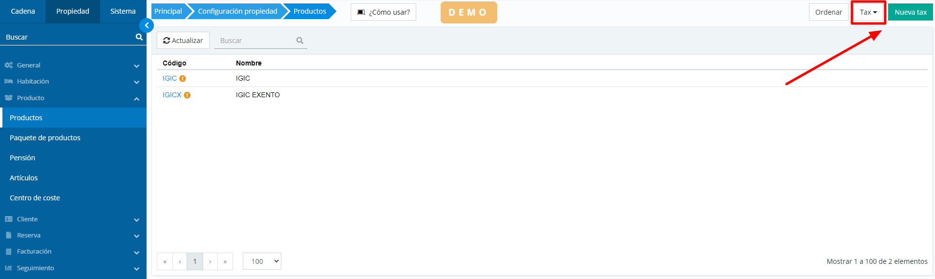 Une fois l'option activée pour travailler avec le IGIC dans la propriété, la deuxième étape sera de configurer les types de IGIC avec lesquels nous travaillerons.
