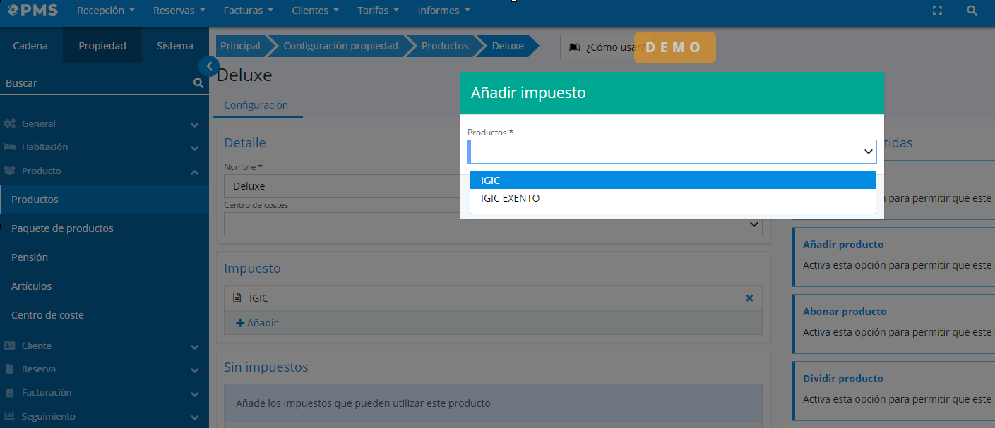 - Copier à la propriété : Cette option vous permettra de dupliquer le produit IGIC et de le copier dans une autre propriété de la chaîne.