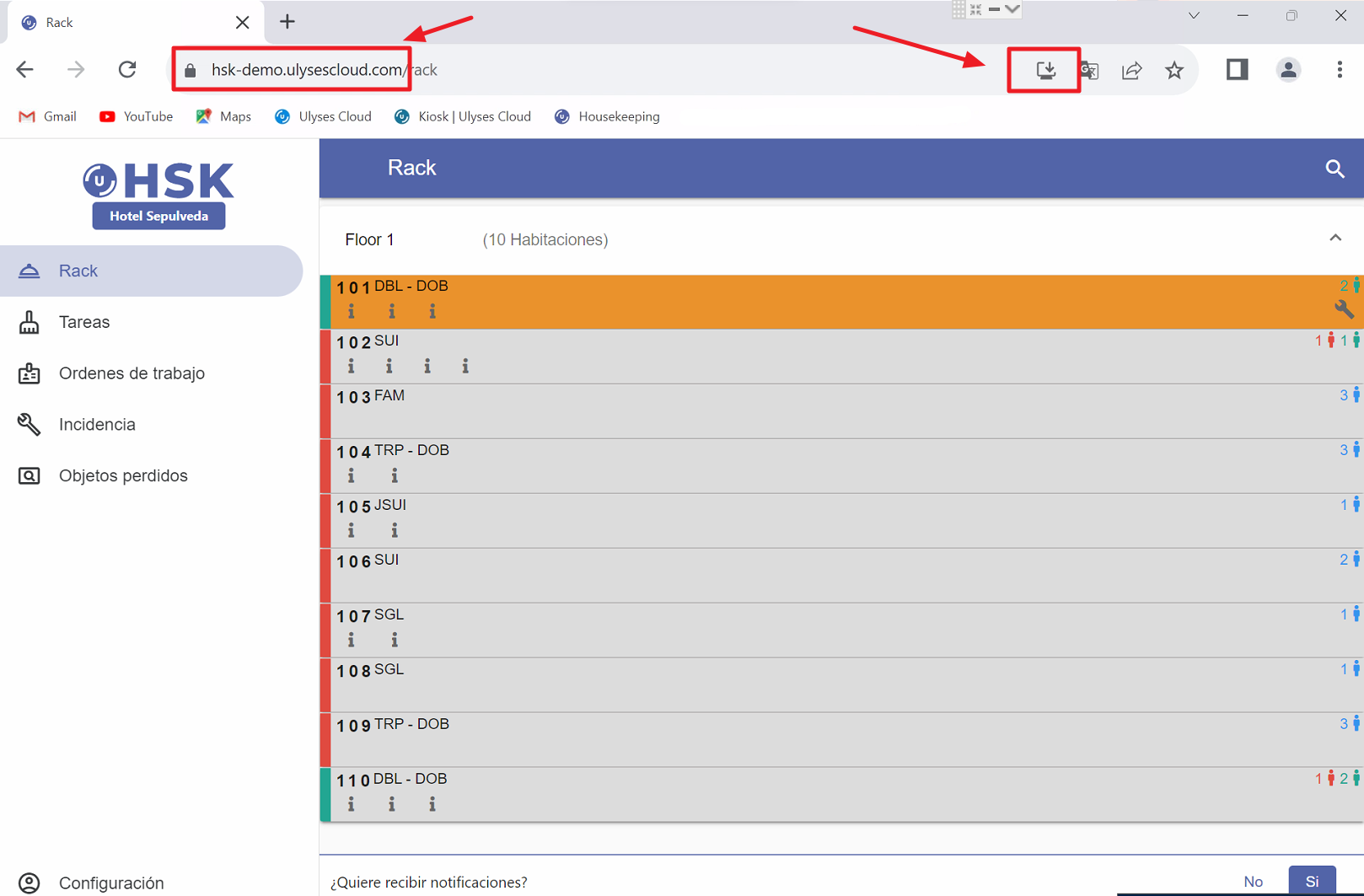 Par exemple, si l'adresse habituelle est "tudominiohotel.ulysescloud.com", dans la barre d'adresses vous devez écrire "hsk-tudominiohotel.ulysescloud.com".