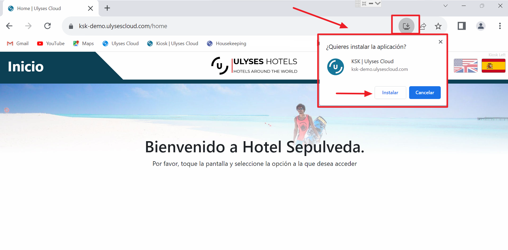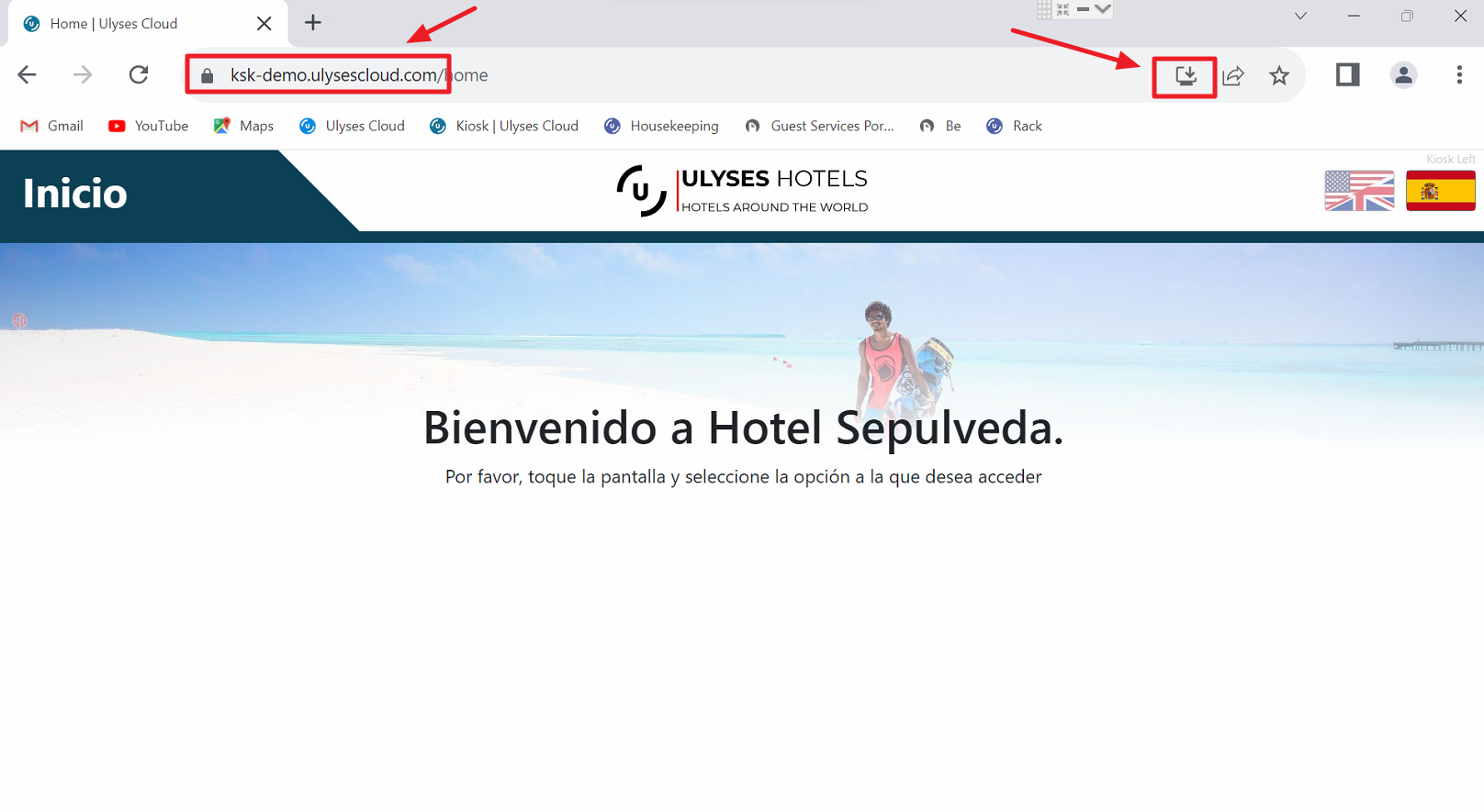 Par exemple, si l'adresse habituelle est "tudominiohotel.ulysescloud.com", dans la barre d'adresses vous devrez écrire "ksk-tudominiohotel.ulysescloud.com".
