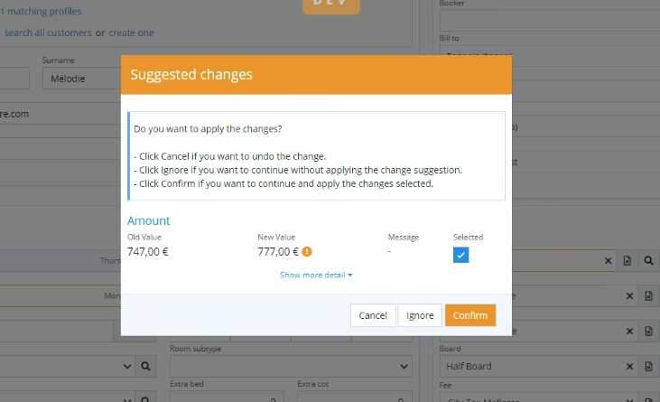 Auparavant, les utilisateurs pouvaient sélectionner l'option "Ne plus demander" lors d'un changement dans une réservation. Pour que cette option ne s'affiche pas, la case Modal remaining action doit être désactivée.