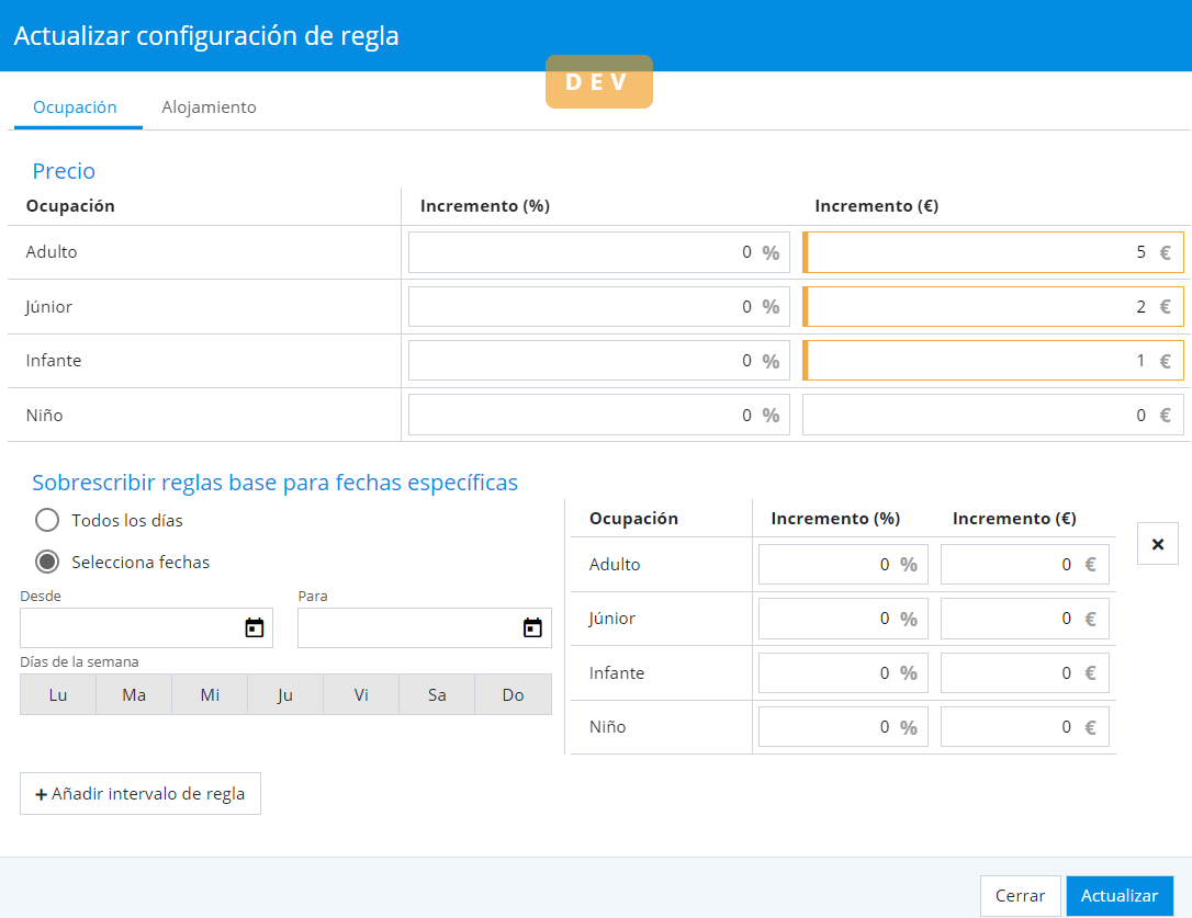 Tarifs > Nouvel assistant de configuration des règles de prix. Une couche d’assistance est créée pour faciliter l’introduction de ces règles incrĂ©mentales ou de rĂ©duction par typologies et occupations :Â