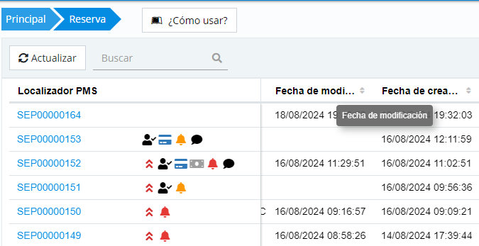 Ă€ partir de cette version, un nouveau champ a Ă©tĂ© ajoutĂ© dans les listes suivantes, qui affiche la date et l'heure de la dernière modification subie par la rĂ©servation. Ce champ, appelĂ© 'Date de modification', permet aux utilisateurs de visualiser rapidement et prĂ©cisĂ©ment les changements, facilitant ainsi le suivi et la gestion efficace des rĂ©servations.Â