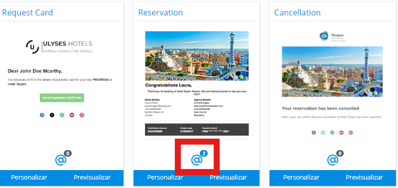 Avec cette nouvelle version, il est possible de créer plusieurs versions de modèles d'emails, permettant une personnalisation accrue dans la communication avec les clients. Les utilisateurs peuvent prévisualiser et sélectionner le modèle adapté à la situation, comme les réservations ou annulations, et configurer un modèle par défaut pour accélérer l’envoi d’emails personnalisés. Le chiffre bleu à côté du symbole @ indique le nombre de versions disponibles pour ce modèle en particulier.