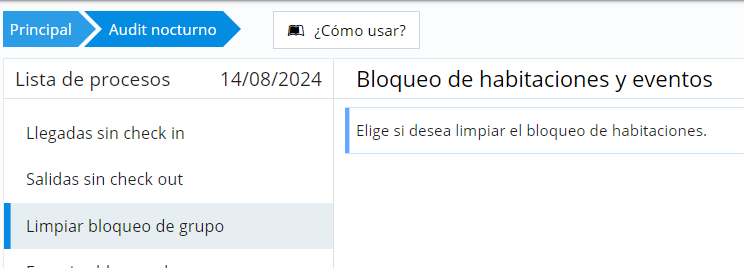 - Audit nocturne > un étape supplémentaire de nettoyage du blocage de groupe est ajoutée. Dans le cas où le wash du groupe avec entrée du jour n’a pas été réalisé, cela prévient les écarts d’occupation entre blocage et réservations.