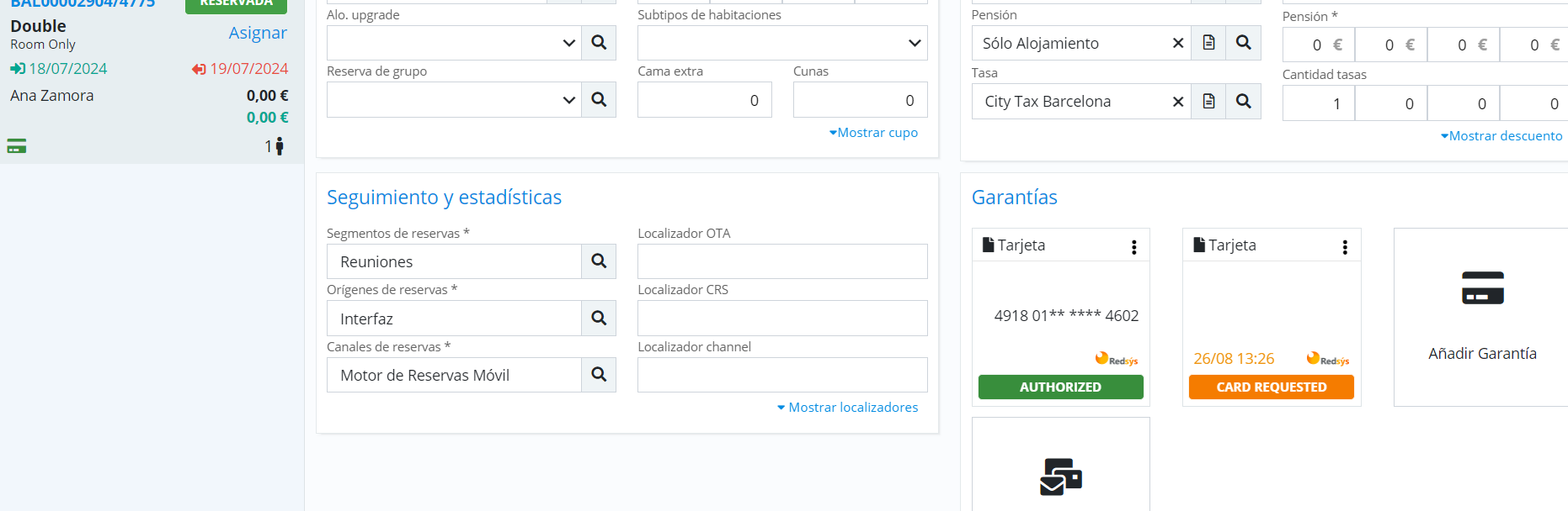 Ajouter une garantie : Réservation directe au front office ou walk-in. Lors de l'ajout de la garantie, la passerelle de paiement s'ouvre. Saisir les données de la carte via le portail Redsys.