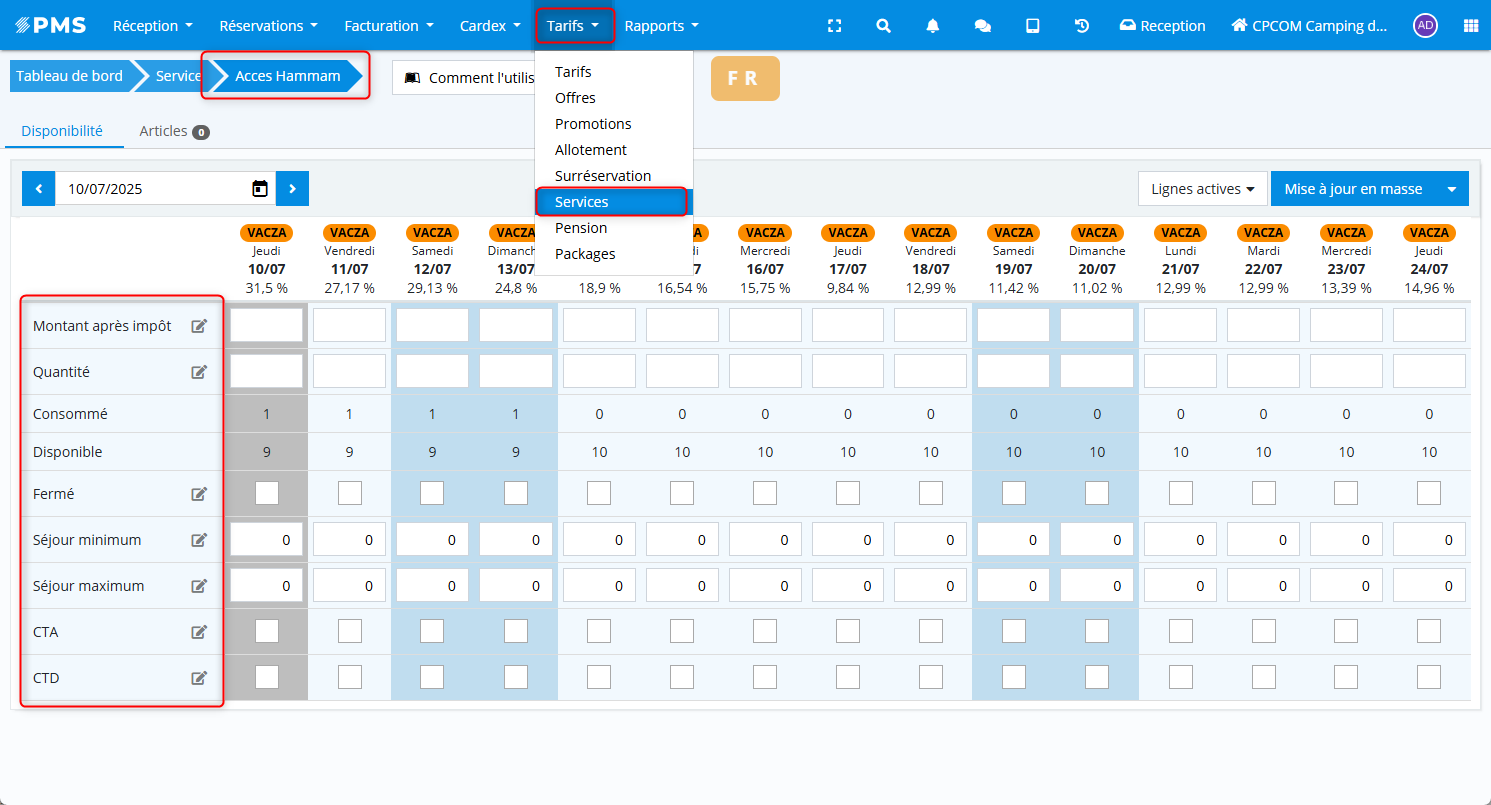 Cette fonctionnalité permet de piloter finement la vente des services proposés par l’établissement.